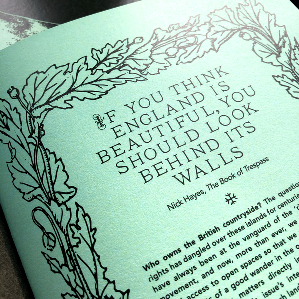 The question of land rights, and who owns the British countryside, has dangled over these islands for centuries. Nick Hayes addresses free access to open spaces directly in this issue’s interview, while Zakia Sewell speaks of discovering a different kind of Britain, the Albion that she has navigated on her excellent BBC radio shows.